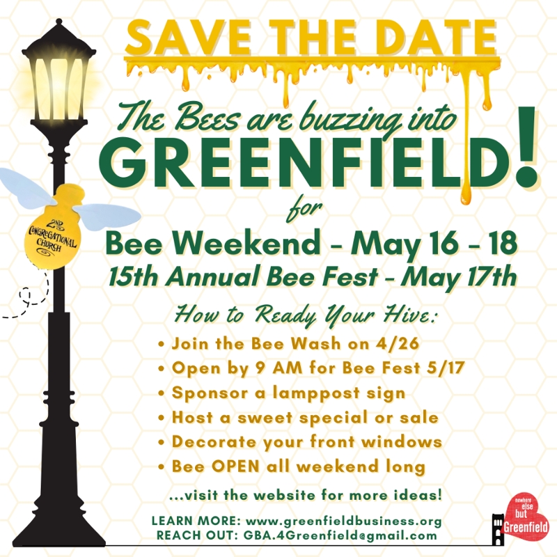 April 26th kicks off the 51st season of the Greenfield Farmer's Market, and with it, the return of more folks downtown and out about all over Greenfield! We are marking this Earth Day weekend with a Downtown Spruce Up and Bee Wash, to get the downtown corridor and Bee sculptures ready for May's Bee Weekend, May 16th - May 18th.