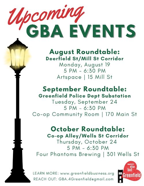 The City of Greenfield and the GBA are working together to centralize business location and event information, to make it easy to find out what's happening ALL OVER Greenfield! Adding your business listing to VisitGreenfieldMA.com and posting your events there will automatically populate our Social Media channels and the kiosk on the Greenfield Common, making it easier for people to find you - whether they're visiting from away or live right around the corner.