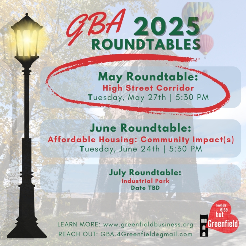 The GBA is here to advocate for your needs, and support the healthy redevelopment and growth of Greenfield - and the more we hear from YOU, the more effective our advocacy can be. Come share your perspective and opinions, hear about how to get involved with Greenfield events and marketing efforts, and work with us to restore Greenfield as the heart of Franklin County.