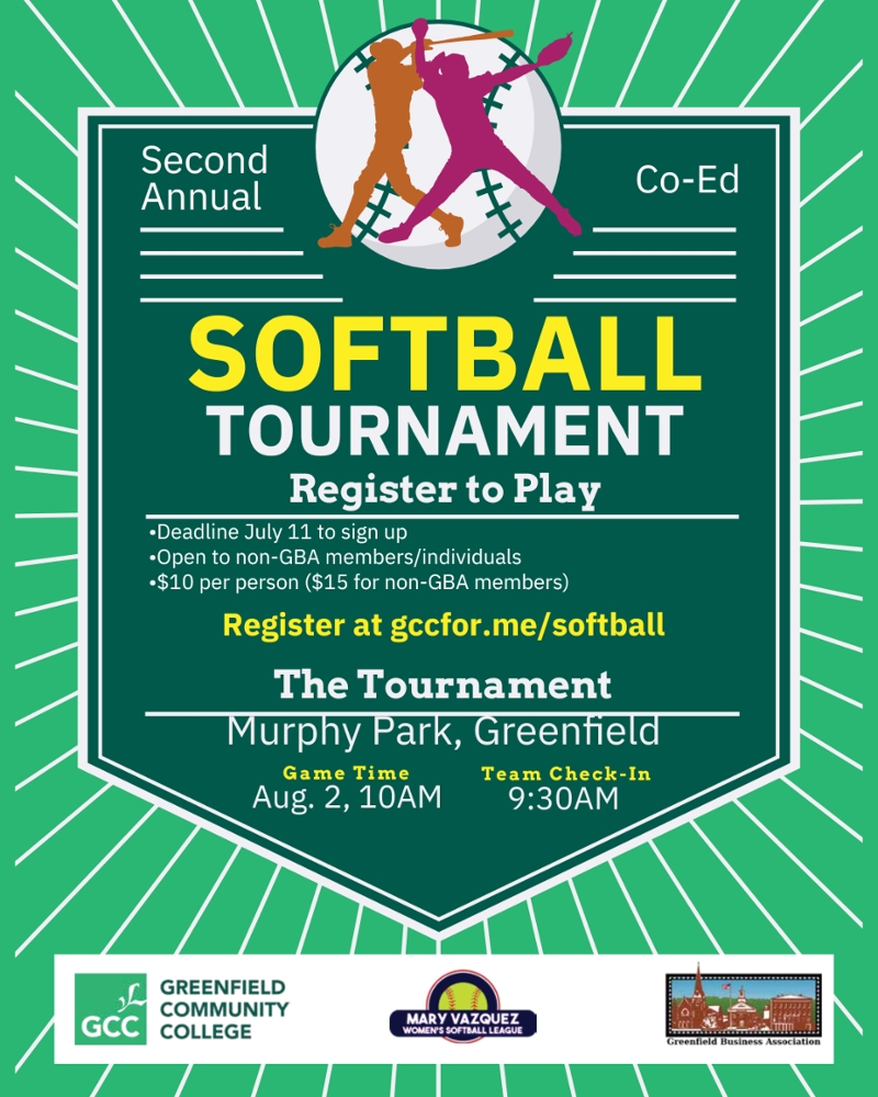 The Greenfield Business Association, Greenfield Community College and the Mary Vasquez league is sponsoring a double elimination softball tournament! Registrat