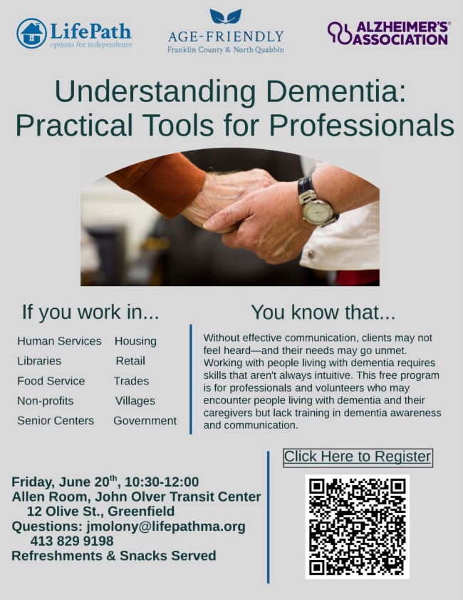 People working in the community know that without empathic, effective communication, clients won’t feel heard—and their needs may go unmet. Yet working compassionately and effectively with people living with dementia requires a skill set that isn’t always intuitive. LifePath’s Age & Dementia Friendly Initiative and the Alzheimer’s Association present “Understanding Dementia: Practical Tools for Professionals” a free program designed for human service professionals and volunteers who may encounter people living with dementia and their caregivers in their work but have not received adequate training in dementia awareness and communication strategies. Snacks and refreshments will be provided.
