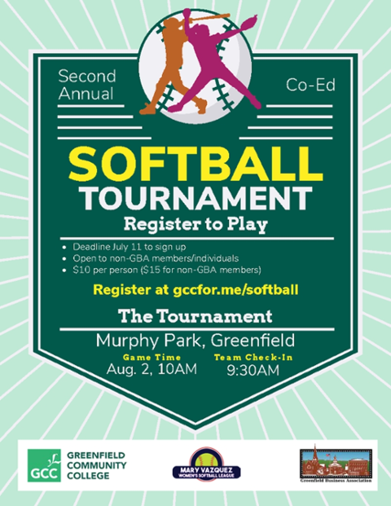 We are still looking for 4-6 players for the second annual Franklin County Softball Tournament! The Greenfield Business Association, Greenfield Community College and the Mary Vazquez league is sponsoring a double elimination softball tournament on Saturday, August 2nd at Murphy Park in Greenfield from 10:00am-6:00pm. Registration is requested by July 25th so we can order food, secure equipment and so forth.