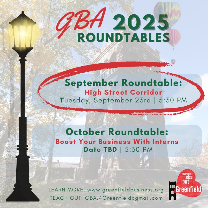 Our September Roundtable focuses on the active High Street Corridor, bringing together business owners and stakeholders to discuss the district's needs, unique values, and potential improvements. The Greenfield Business Association's work is strengthened by the knowledge provided directly by the business community.