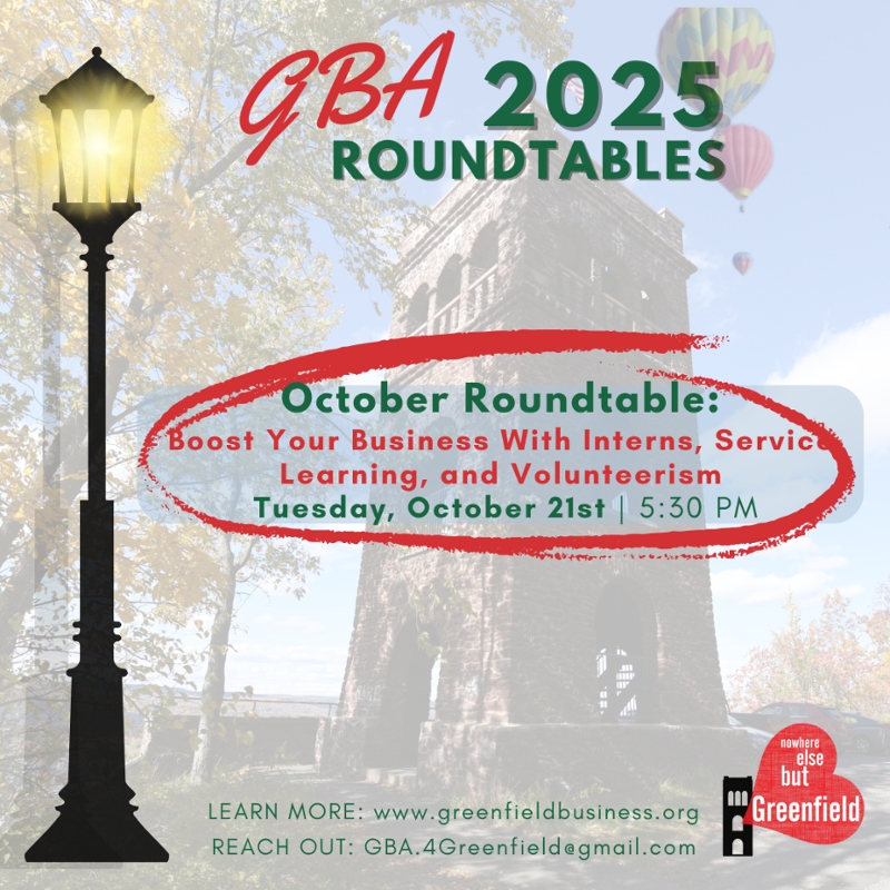 Our October Roundtable focuses on a valuable pathway to building capacity in your business - Internships, Service Learning, and Volunteerism! Together with GCC, MassHire, and others, the GBA is bringing together business owners and stakeholders to discuss the needs, unique values, and potential improvements that can be served by activating students and young people in the community. The Greenfield Business Association's work is strengthened by the knowledge provided directly by the business community, and we will be discussing the barriers to and structures around engaging people through these avenues of employment/volunteerism.