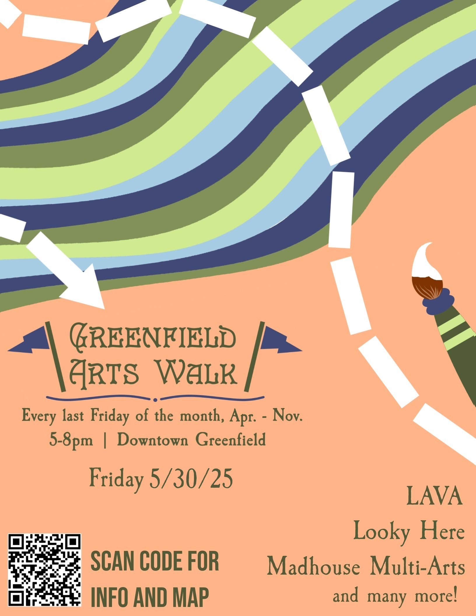 Scan the QR code below for a full guide. After you've wandered, head over to Ice Cream Alley, The Doc & Witch & Smitty's Pub -- all Art Walk Sponsors!